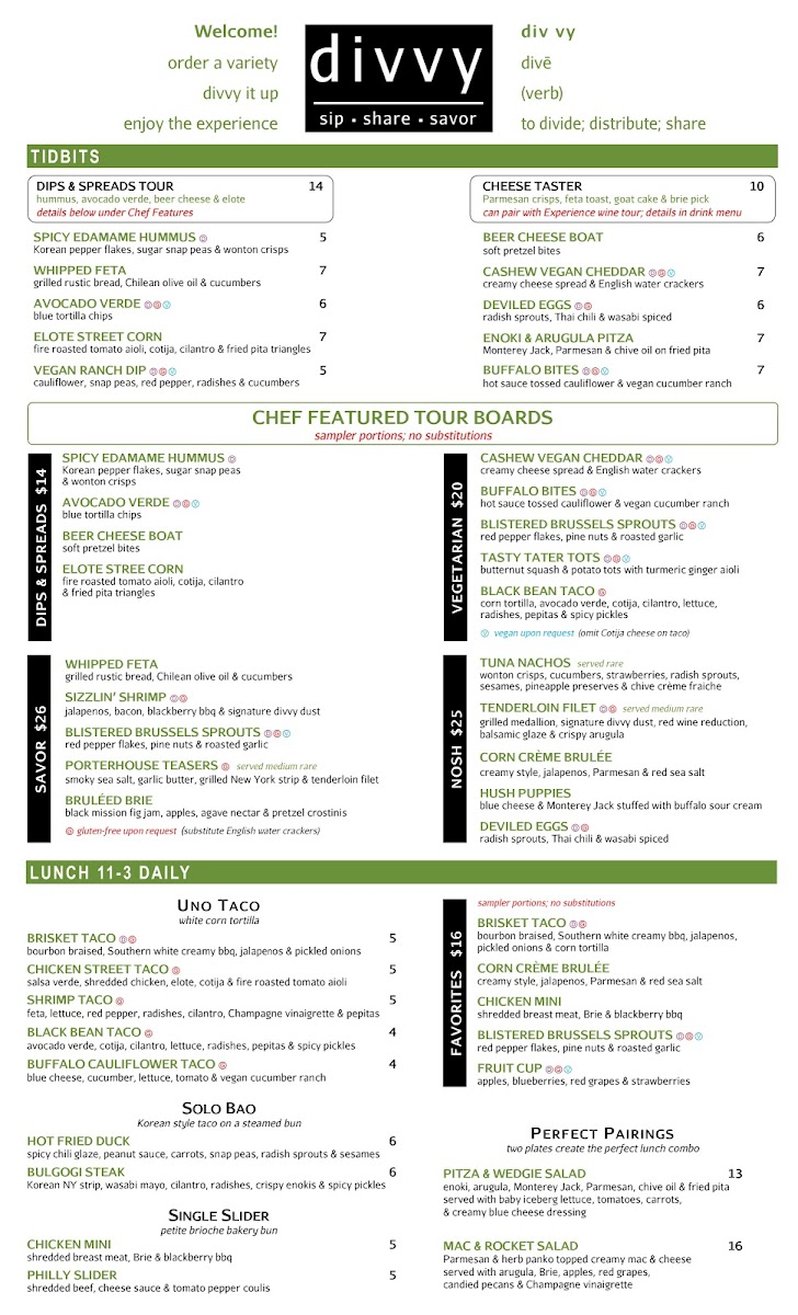 Introducing divvy, a dynamic dining destination located at 71 City Center Drive in Carmel, IN. Known for its emphasis on shareable small plates, this innovative eatery caters to a variety of tastes and dietary preferences, making it perfect for both casual outings and special occasions.